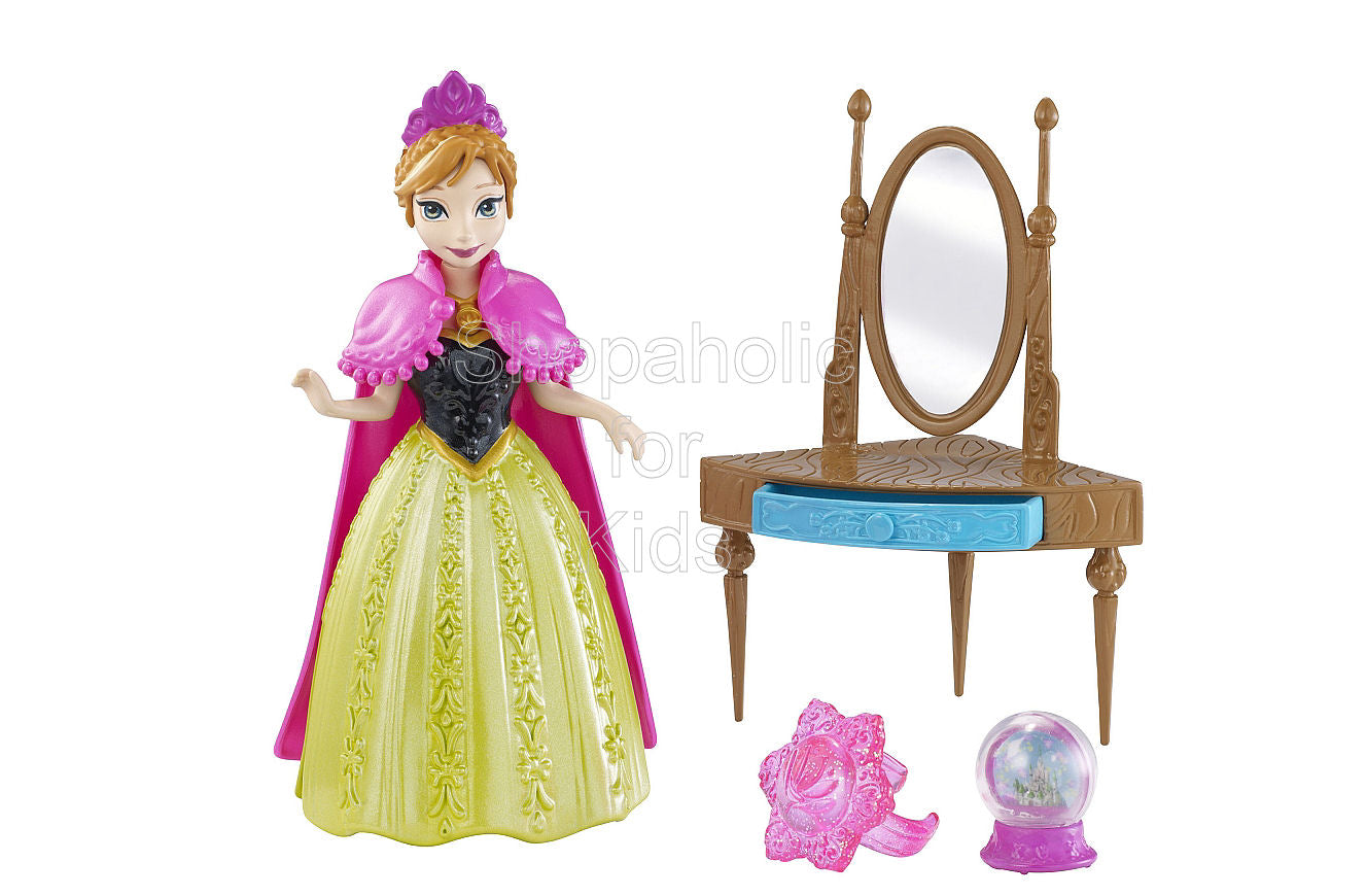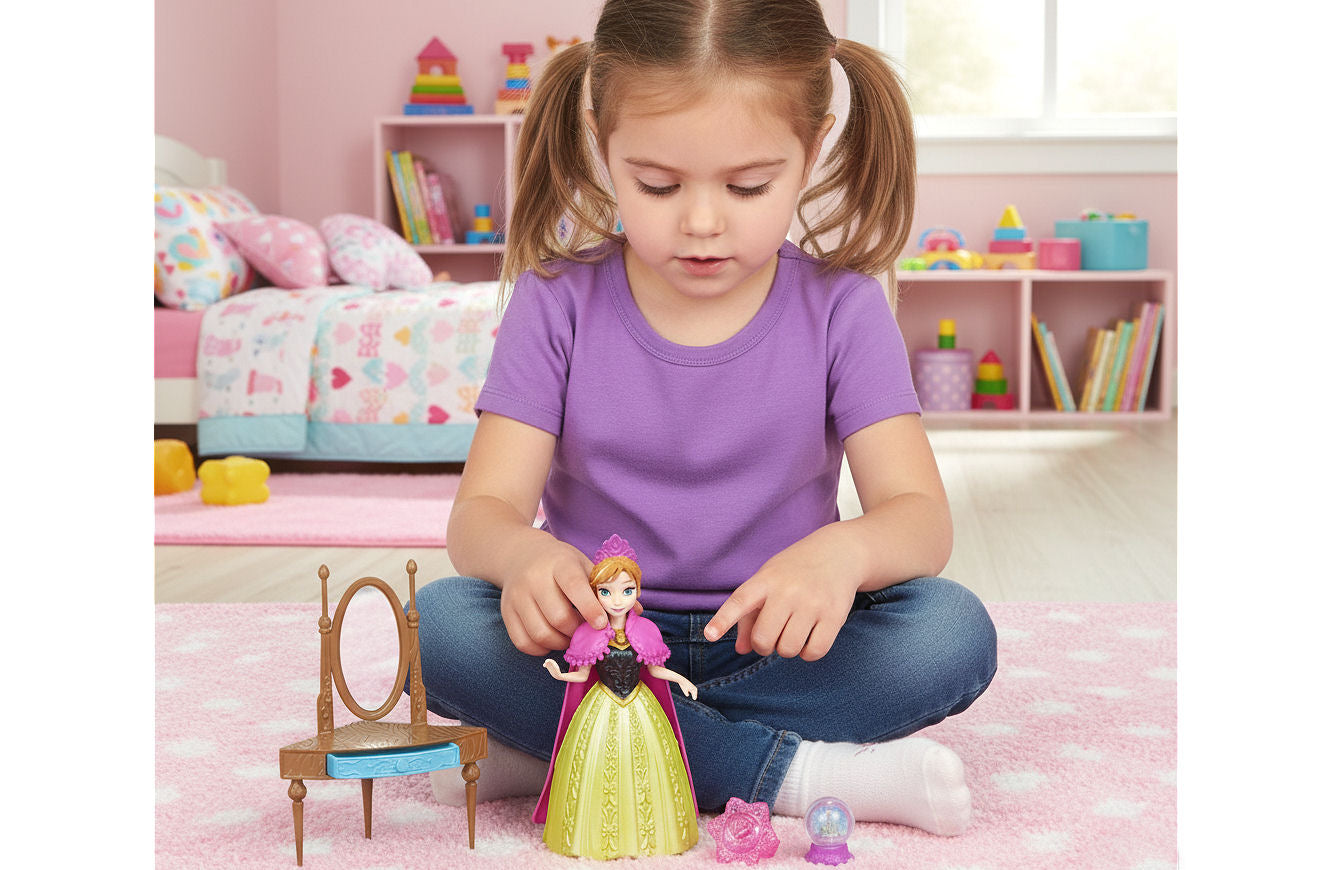 This Anna set features a vanity (with a working drawer!) and a snow globe as well as a charming pink ring for your little girl. The small doll fashions are in MagiClip form that is gentle on small fingers and so easy to dress. She also wears a majestic cape and tiara to complete her iconic look. Girls will love imagining new adventures for this Frozen character!