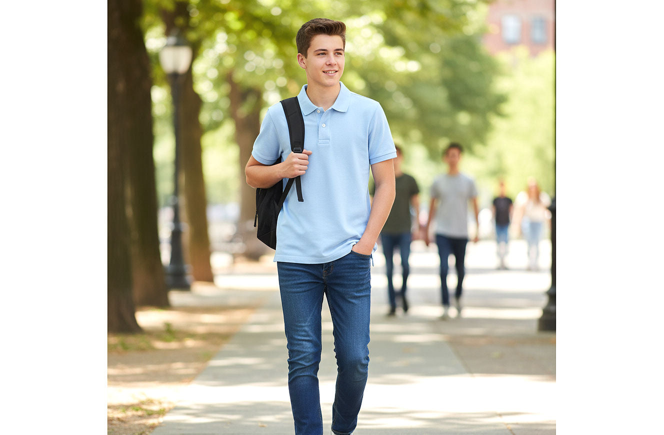This is made of 100% cotton pique.  It has a flat rib-knit collar, a button-front placket, and side vents at hem.  Tagless label for better comfort.